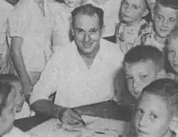 Gus Goose, the "lazy and gluttonous" cousin of Donald, was introduced on May 9, 1938, almost a year before Gus' film debut in Donald's Cousin Gus, that was still in early stages of production.[1] On November 4, 1940, Taliaferro and Karp introduced a comic strip version of Daisy Duck, as Donald's new neighbor and love interest, shortly after her film debut in Mr. Duck Steps Out (1940). This was Daisy's first appearance in comics, not counting her prototype, Donna Duck, who appeared earlier in the British comics and was later introduced by Taliaferro and Karp as Daisy's rival.[1] Grandma Duck, Donald's grandmother, was introduced on September 27, 1943, and was created for the comic strip by Taliaferro and Karp. Taliaferro based the design of the character on his mother-in-law and her old-fashioned ways. Taliaferro's version of Grandma is a hard-working farmer, but out of touch with the technological progress of the world surrounding her.[1] Although not created by him, Scrooge McDuck joined the cast of the comic strip on February 13, 1951, and Ludwig Von Drake on September 25, 1961.[1] Donald's car, the '313', or '1934 Belchfire Roustabout', was designed by Taliaferro on July 1, 1938, from a car that Donald drove in his first titular film, Don Donald (1937). The car has been associated with the character in comics ever since.[1]