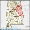 Bon Air, Childersburg, Fayetteville (part; also 6th), Lincoln, Mignon, Munford, Oak Grove, Oxford (shared with Calhoun and Cleburne counties), Sylacauga (part; also 6th), Talladega, Vincent (part; also 6th; shared with St. Clair and Shelby counties), Waldo