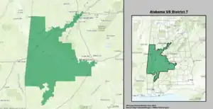 The district has been majority nonwhite, with a majority of African-American residents, since the redistricting following the 1990 census. As such, and with a Cook Partisan Voting Index rating of D+13, it is the most Democratic district in Alabama.[4] The district was adjusted due to the judicial selection of a new congressional map as a result of the case Allen v. Milligan, with its share of Montgomery and half of Clarke County shifted to the 2nd district and a portion of Tuscaloosa County given to the 4th district. It is currently represented by Democrat Terri Sewell.