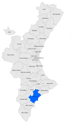 Alacantí (Valencian: [alakanˈti], Spanish: [alakanˈti]), also known in Spanish as Campo de Alicante[2][a] and Comarca de Alicante,[a] is a comarca in the Valencian Community, Spain. It is bordered by the comarques of Marina Baixa and Alcoià to the north, Baix Vinalopó to the south and Vinalopó Mitjà to the west.