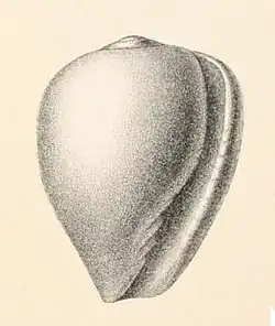 (Original description) Shell: Small, obovate, with a scarcely noticeable spire, strong and porcellanous white, lustrous, with an exceedingly narrow aperture. The outer lip is truncate but not emarginate, varixed, and toothless, while the columella has four small folds ending in a sharp point.