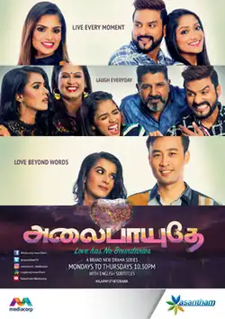 Alaipayuthey (Tamil: அலைபாயுதே) is a 2017 Singaporean Tamil-language soap opera starring A. Panneeirchelvam, Puravalan Narayanasamy, Jenani, Jayaganesh, Magalakshmi Sudarsanan, Brendon Kuah, Rubini and Vimala Velu. It aired every Monday through Thursday at 10:30PM (SST) on MediaCorp Vasantham from 16 January 2017 to 30 March 2017 for 43 episodes.[1][2] It replaced Masala. The show's final one-hour episode aired Thursday 30 March 2017 at 10:00 PM SST.
