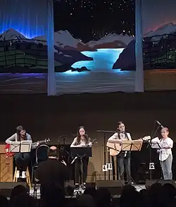 The Alaska Folk Festival, which was established in 1975,[1] is a celebration of music. Folk music is an important component, but all types of music are encouraged. Some acts include dance and poetry. Fifteen minutes is allocated for each act except guest performers (guest performers get 45 minute sets). Limits include no overly long setup times and no use of recorded music. The festival has performances from a variety of solo artists and musical groups; it provides workshops for people interested in the music and wanting to receive instruction. There are dances, jams, singer-songwriter showcases, and other events. Each year, artwork by an Alaskan artist is featured on posters and merchandise (including the cover art for the program).[2][3] All events are free to the public, with no auditions for the acts, however they must apply in time.