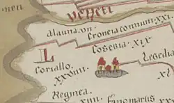 The Peutinger Table indicates that the ancient station of Alauna, which is not represented by a vignette like important towns, was situated on the Roman road connecting it to Coriallo (Cherbourg). The road continues southeast towards Crociatonum, which may be Saint-Côme-du-Mont or Carentan, the Baie des Veys, Augustodurum, and Aregenua (Vieux) before heading towards Rotomagus (Rouen) along the coast.[8]