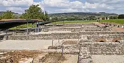 The initial construction of the ancient city, which does not appear to be directly derived from the Latène occupation, is dated to the Augustan period. It primarily affected the northern and central parts of the site, a smaller area than the previous occupation.[31] The principium (first forum) and the central sanctuary in its initial state are attributed to this period.[32]