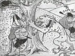 Caricature shows Albania (the lion) breaks the chain of Islam that linked it to the Turk (man with the fez, left) and Orthodoxy that bound it to the Greek (man with hat and tassel, right). In background a Serbian (man wearing šajkača behind tree, centre left) and Montenegrin (represented as black rat in tree branches, top left) preparing to ambush the lion