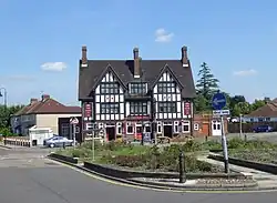 During the 1930s, New Ideal Homesteads were the largest commercial developer active in north west Kent, known for keeping costs at a minimum by using prefabricated materials.[2] They built the Albany Park estate in the middle of that decade, on land that had formerly been the Tanyard and Hurst Farms, part of the estate of the Vansittart family who lived at nearby Foots Cray.[1] Most of the area had consisted of fields and spinneys, although nearby there was both an eighteenth-century mansion known as Hurst or Hurst Place, and Sidcup cemetery, which had been established in 1912.[1]