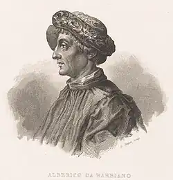 Alberico da Barbiano (c. 1344 – 1409) was a condottieri. His master in military matters was the English mercenary John Hawkwood, known in Italy as Giovanni Acuto. Alberico's compagnia fought under the banner of Saint George, as the compagnia San Giorgio.[1]