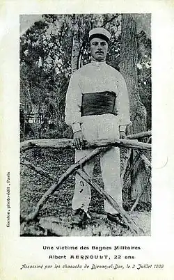 Albert Aernoult was born on 19 October 1886 in Romainville, Seine, son of a laborer.[1] He became a ditch digger.[2] He was a trade union activist, and played a major role in the strike of metro workers at the end of 1905. He was denounced as one of the activists. To escape prosecution he left Romainville and found work in the mines of Courrières, Pas-de-Calais. He was sentenced in absentia to two years in prison for his strike action. On returning to Romainville he was arrested and completed his sentence, which was reduced to ten months in the Petite Roquette prison.[1] Aernoult was released in 1907. On 26 March 1907 he signed up with the army for three years.[1] It seems that he was told that his police record would be wiped out if he enrolled. He was posted to an African battalion, and soon began getting into trouble. On 1 July 1909 he was sent to the disciplinary camp at Djenan ed-Dar in the Béni Ounif District of Algeria.[2]