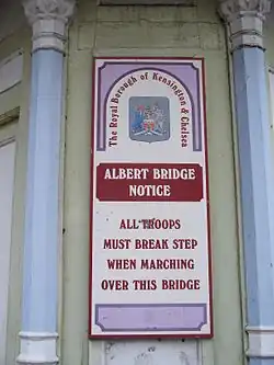 2. ^ The original sign at each end of the Albert Bridge read: "Officers in command of troops are requested to break step when passing over this bridge", which can be seen in the newsreel issued by British Pathe on 24 May 1954.[20]