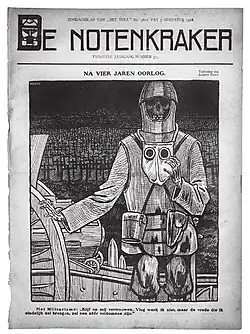 The following year, Het Volk, a socialist newspaper, held a contest to find an artist for their weekly Sunday supplement. Hahn was selected and signed to a permanent contract.[2] Soon, he began creating political cartoons in addition to illustrations; for De Notenkraker as well as Het Volk, and was able to quit his teaching job in 1905.[1] After the beginning of World War I, his works dealt almost exclusively with denouncing the needless death and destruction.
