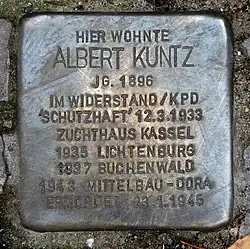 Albert Kuntz (4 December 1896 – 22 January 1945) was a German goldsmith, soldier, communist and concentration camp victim. A soldier in the First World War, Kuntz rose to become an elected representative of the Communist Party of Germany in the Prussian Landtag.[1] In 1933 he was arrested by the Gestapo, and sent to a succession of prisons and concentration camps. He died in January 1945 at the Mittelbau-Dora concentration camp, where he had been organizing the sabotage of the V-2 rocket production line.[2] Following his death, he was revered as an anti-fascist hero in East Germany.[3]