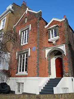 No. 20, known as Tudor Lodge, which has been listed Grade II by Historic England, was built in the 1840s as a house and studios for the artist Charles Lucy (1814–1873). The poet and novelist George MacDonald (1824–1905), who lived there from 1860 to 1863, described the house in his 1871 novel The Vicar's Daughter.[4] It now has a blue plaque, commemorating MacDonald, that was erected by English Heritage in 2005.[5]