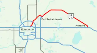 The highway begins at the intersection of 50 Street and Highway 16 (Yellowhead Trail) in Edmonton.[4] It proceeds north along 50 Street to Manning Drive, where it diverts northeast before passing over Anthony Henday Drive (Highway 216). Before leaving Edmonton, Highway 15 continues northeast past the southern terminus of Highway 28A. Within Sturgeon County, it intersects with the eastern terminus of Highway 37 and then turns southeast to cross the North Saskatchewan River and intersect with the northern terminus of Highway 21 in the City of Fort Saskatchewan. From this junction, Highway 15 travels northeast again and then east, intersecting with Highway 45 and Highway 29. It then turns southeast and passes through the towns of Lamont and Mundare. At the outskirts of Mundare, it begins a 2.1 km (1.3 mi) concurrency with Highway 855 before ending at Highway 16.