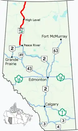 From the south, Highway 35 begins at its intersection with Highway 2, approximately 5 km (3 mi) north of the Town of Grimshaw and 19 km (12 mi) west of the Town of Peace River, and ends at Alberta's boundary with the Northwest Territories.[2] It continues on as Northwest Territories Highway 1. It is one of only two highway-grade roads connecting the NWT with a province (the other being the Liard Highway), and the only one connecting the NWT with Alberta. Highway 35 passes through the towns of Manning and High Level.