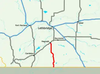 Highway 62 is a 52-kilometre (32 mi) north–south highway in southern Alberta, Canada that connects Highway 5 in Magrath to the Canada–United States border south of Del Bonita. It continues as Montana Secondary Highway 213 in the United States.[1][2][3]