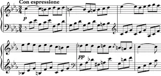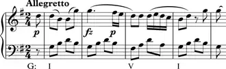 The first two bars of Mozart's Piano Sonata in C major K. 545... The passage consists of an Alberti-bass accompaniment supporting...[a] melody.