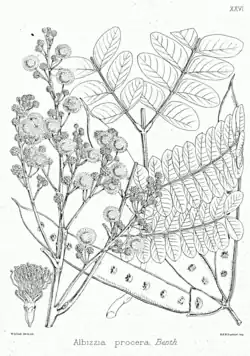 The genus name Albizia honors the Florentine naturalist Filippo del Albizzi, while the species name is derived from the Latin word 'procerus', meaning 'very tall or high'.[4]