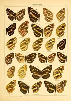 N. themis Leech (54f) differs from the preceding species in the median band on the hindwing beneath being anteriorly abbreviated and in the 2—3 violet spots standing in the prolongation of the band being absent; on the other hand, there is on the forewing below a large light spot near the distal margin between the radials.*) The distribution-area of this form according to Oberthur extends from West China (Siaolou) to Sikkim, where it is replaced by the nomenclatorially typical form, N. nycteus Nicev., which has white instead of yellow spots. *Contrary to customary treatment N. themis and thisbe are here dealt with as different species. In this I follow Ch. Oberthur's opinion (Etudes de Lepidopterol. Comparee II), although the differences do not appear to be quite sufficient for specific separation. There can hardly be any doubt that the classification of the species of Neptis, especially of the thetis group, will be modified in many respects as our knowledge of the geographical distribution and seasonal variation increases. At present one has to be content with a grouping which is the more probably correct classification according to one's personal opinion. As not weighty enough I must regard the characters of a number of species described by Oberthur in the place cited; particularly the separation of thisbe from themis and the specific value attributed to some forms of the thestias series does not seem to be tenable. — Stichel. [2]