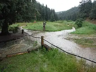 The morning of June 27, when the flood occurred, Crew 380 from Sacramento, California, was entering the third day of their twelve-day trek. They were situated at a campsite in Indian Writings[14] near North Ponil Canyon[15] that was about 20 feet above a small portion of Ponil Creek.[16][17] Troop 606, from Irving, TX, had recently camped at Ponil Canyon the night before, bringing the rising rivers to staff members attention. Four members of Crew 380, including 13 year-old Alden Brock, the ranger assisting the crew,[17] and two other youth Scouts were swept away by the flood from their campsite at about 4:30 am.[18][19] The New Mexico State Police arrived at around 9:35 am on a search and rescue mission.[20] The two Scouts and the ranger were quickly located but not Brock. They found Brock dead at around 11:00 am,[21] approximately one mile away from the location from which he was originally swept.[17][19] Crew 380 decided to finish their trek despite the incident in honor of Brock.[22] Brock's death received nationwide attention, particularly from the Scouting community; fatalities are exceedingly rare at Philmont, and this was the only flood-related fatality in Philmont's history.
