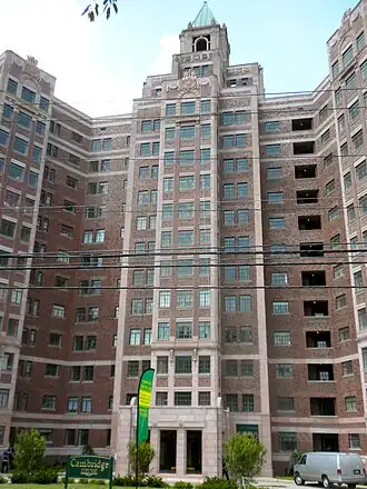 Built in the Jacobean Revival style, Alden Park Manor was founded and built in 1926. The complex has three sets of towers - the Manor, Kenilworth, and Cambridge buildings. Designed by Edwin Rorke and developed by Lawrence Jones, it was built in a park-like setting on thirty-eight acres that had been the Justus C. Strawbridge estate. It was the first co-operative apartment complex in Philadelphia, although it now operates only as rentals.[2]