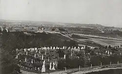 Initially located away from the main camps, the cemetery was bounded by Thorn Hill to the north, Round Hill to the east, and Peaked Hill to the south-west. To the west of the cemetery a small wooden chapel was constructed. It was not until 1875 that a central record of burials was created by the Royal Engineers (earlier records had been split amongst various camp churches).[3]