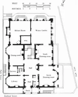 Aldford House was a grand mansion built on London's Park Lane in 1894–97 for the diamond magnate, Alfred Beit.[2] The architects were the Scottish partnership of Eustace Balfour and Hugh Thackeray Turner.[2] Its style was somewhat Jacobean but it was not well-received and was demolished in 1929.[3] A block of flats with the same name was then constructed on the site by the architectural partnership of George Val Myer and F. J. Watson-Hart, advised by Edwin Lutyens.[4]