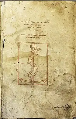 The Aldine Bible[1][2][3] (full title: Πάντα τὰ κατ᾿ ἐξοχὴν καλούμενα βιβλία, θείας δηλαδὴ γραφῆς παλαιᾶς τε καὶ νέας. Sacrae scripturae veteris novaeque omnia.) is an edition of the Bible in Greek (the Septuagint is used for the Old Testament) begun by Aldus Manutius, and published in Venice in 1518 by the Aldine Press. It is the first complete Bible printed entirely in Greek (its Old Testament is the Septuagint) to be published.