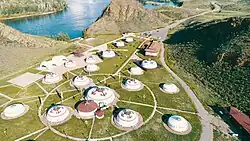 The complex is located by Ulug-Khem, the local name of the upper reaches of Yenisey River. The seven yurts in the central part of the layout symbolize the Sun System. The central yurt is a restaurant of national cuisine. The four larger yurts around the restaurant are known as the "president yurts". Further around are "economy class" yurts and Todha region-style chums for tourists, and other amenities. The guests, in addition to walking in the surrounding steppe and hills may learn traditional skills: horseback riding, bow shooting, milking a goat, making cheese, learn traditional Tuvan throat singing, as well as take part in ancient rituals. Aldyn-Bulak is a strictly non-smoking area, because all constructions are made of natural, easily flammable materials.[1]