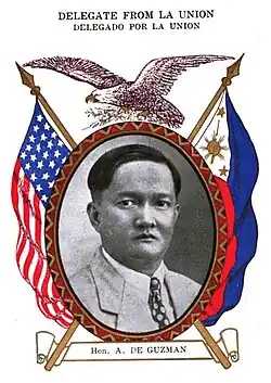 In 1916, De Guzman was elected to the Philippine House of Representatives on behalf of Pangasinan's 4th district, serving until 1919.[1] After Camilo Osias was elected Resident Commissioner to the United States in 1929, De Guzman was elected to the Senate of the Philippines in special elections representing the 2nd district for the remainder of his term until 1931.[2] In 1934, De Guzman was elected as a delegate from La Union's 2nd District to the Constitutional Convention which drafted the 1935 Philippine Constitution.[3]