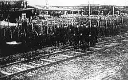 The Polish military authorities' description of the Aleksandrów camp dates back to when Russian internees inhabited the complex. It comprised 3 barracks, each accommodating 800 people, and 5 smaller barracks, each with 2 kitchen rooms. All these structures were made of wood.[12] The camp command occupied one of the smaller barracks.[12] The camp included a laundry, sanitation facilities, 4 disinfection chambers, and a quarantine room.[12] The buildings were equipped with water supply and sewage systems, and the barracks had electric lighting.[12] However, the facility was entirely unsuitable for winter conditions and lacked a hospital. Therefore, upon arrival in December 1921, the internees had to remain in railway carriages, and the sick were transported to the hospital at Internment Camp No. 15 in Toruń.[10] Emergency repairs to the buildings were carried out by groups of soldiers.[8]