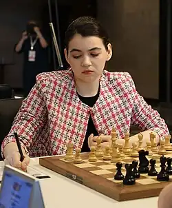 Goryachkina's first youth team success was when she led Russia to a gold medal while scoring 3/3 on the top board at the under-18 girls' European Team Championship in 2012.[86] She played the second board at the under-16 Chess Olympiad in 2014 behind David Paravyan. Russia finished runner-up to India for a silver medal.[87] Individually, Goryachkina finished fourth on the second board, and won the girls' gold medal. She also won a brilliancy award for her seventh-round game with black against Cemil Can Ali Marandi for dangerously sacrificing a rook and a knight on the kingside.[88][89]