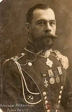 Aleksandras Plechavičius was mobilised to the Imperial Russian Army in 1914.[2] Together with his elder brother Povilas, he completed the Cossack Cavalry School in Orenburg.[3] While fighting against the Germans and the Ottomans, he was injured twice. In 1917, he was promoted to the commander of his cavalry squadron.[2]
