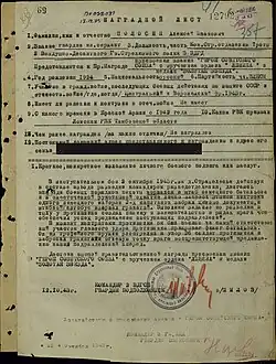 In the offensive battle for the village of Strakholesye on 2 October 1943, as a squad leader of a reconnaissance platoon moving ahead of the infantry, [he] burst into a German battalion headquarters and in a fierce hand-to-hand fight singlehandedly bayoneted a German major and two captains, retrieved valuable documents, and blew up a staff car with a grenade. Completing the reconnaissance mission in the enemy rear, he sowed panic and confusion in the enemy ranks, ensuring the success of the advancing units. When the enemy counterattacked, he was sent to the most critical section of the main blow of the enemy, covering the flank of the battalion. He shot 26 enemy soldiers at point blank range with a captured weapon and threw grenades at the enemy firing position impeding the advance of our units.[3]