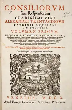 Alessandro Trentacinque (also known as Alessandro Trentacinque d'Aquila, Alexander Trentacinquis, and Alexander Trentacinquius, 1541–1599), was a jurist, writer and patrician from L'Aquila, Italy.[1] The Trentacinque family was also present in Lucoli.[2] Alessandro Trentacinque was mayor of L'Aquila around 1583, carried the noble title of Camerlengo (Chamberlain)[3] and was buried in the Sant'Agostino church in L'Aquila.