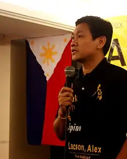 Alexander Ledesma Lacson (born January 5, 1965)[1] is a Filipino bestselling author of patriotic books, a poet, lawyer, businessman, civil society leader, and NGO leader. He is best known as the bestselling author of the books 12 Little Things Every Filipino Can Do to Help Our Country[2] and Five Hundred Years Without Love, for the poem "I am Filipino" and for running in the 2010 Philippine Senate election.[3]