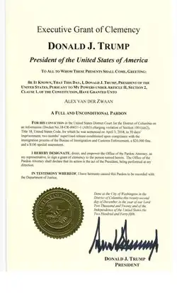 In December 2020, U.S. President Donald Trump pardoned Van der Zwaan in an eleventh-hour pardon prior to the end of Trump's four-year presidential term.[39] The pardon rescinds his U.S. criminal record, allowing him to legally return to the United States.