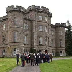 The Monzie branch of the Clan Campbell springs from Sir Duncan of Glenorchy, also known as "Black Duncan of Lochow", the patriarch of the house of Breadalbane.[4] Archibald, a younger son of this old knight, inherited from his father various estates in several of the Highland counties, and transmitted them to his lineal descendants, the Campbells of Monzie. The original designation was "of Fonab," a property in Perthshire, near Killiecrankie, where Viscount Dundee was slain; and the tradition is, that Claverhouse fell by a shot fired by Fonab himself, or by one of his dependants who followed his chief to the field. The Fonab of 1702 commanded the British troops sent to protect the interests of the colonists of Darien against the attacks of the Spaniards, and obtained a signal and decisive victory over a vastly more numerous force of the enemy at Toubocante. For this action a gold medal, bearing on one side a plan of the battle, was voted to him by the Directors of the Indian and African Company of Scotland; while the British Crown rewarded him with a grant of a special coat of arms, with supporters, bearing the motto, "Quid non pro patria"; and as this latter honour was bestowed on him as "Campbell of Monzie,".[5]