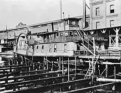 By November 1901, the steamer Idaho was in a critical condition and in need of overhaul. The City Council gave the Wayside Mission permission to build a gridiron at the foot of Jackson street and put the ship on it.[64] But during a severe storm in January 1902, the Idaho broke from its mooring with patients and staff on board. As it was tossed by the waves, its stern was severely damaged by logs that were anchored nearby. People were evacuated from the ship by the city's fire department, and crews of nearby anchored vessels helped to save the boat from sinking, securing it near the wharf.[65] The ship survived the storm and proceeded to be re-moored at its original position.[60][55][66]