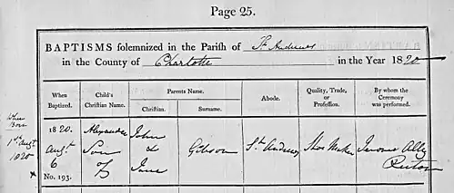 Alexander Gibson was born in St. Andrews, New Brunswick on 1 August 1818.[1] He was the first of seven children born to John Gibson and his wife Mary Jane Johnson, who had immigrated to Canada from Ireland in 1818, accompanied by John Gibson's parents, Alexander Gibson Sr. and Janet Moore, brothers James and Stuart, and sister Margaret.[2]: 146 During Alexander Gibson's childhood in the 1820s the family lived in a log house and farmed six acres of land.[3] The grandparents seem both to have been born in Scotland, but all of the children were of Irish birth. Unlike the waves of poor Irish who were beginning to land in the Maritimes (St. Andrews alone landed several thousands between 1817 and 1818),[4] Gibson's grandfather seems not to have been poor, as he speculated modestly in land in St. Andrews until about 1825, when he applied for and was granted a 60-acre tract of farmland in Oak Bay, near St. Stephen, selling two 20-acre lots and reserving the easternmost portion for his own family. John Gibson, the Boss's father, is given as "shoemaker" on his son's baptismal record, but became a farmer upon the move to Oak Bay.