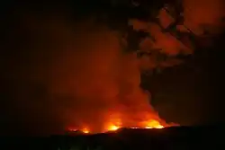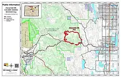 Fire behavior was described as group torching, uphill runs and shortrange spotting of timber, brush, and grass.[26] Volatility challenged ground and aerial firefighting crews, spreading northwest, a total of 7,648 acres with 1% containment.[27] Without verifiable flying range, aviation assets were at times limited. When safe, resources dropped water and fire retardant to help secure the fire perimeter and protect values at risk. Firefighters achieved initial containment by lighting backfires, burning vegetation ahead of the fire's advance, thereby securing the east perimeter near the Sylvan Dale Ranch staging area.[27][19] Fire behavior was described as group torching, uphill runs and shortrange spotting of timber, brush, and grass.[26]