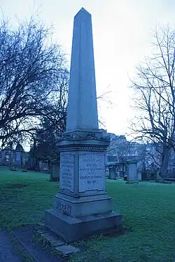 He is buried in Greyfriars Kirkyard in Edinburgh, immediately north of the church.