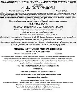 - ^ Rascanu, Dan (March 31, 2022). "English: Advertising Poster "Institute of Medical Cosmetics A. M. Ostroumov", Moskow, Russia, from about 1912, with translation from 2022. Photo collage based on an original photo from the family Rascanu - Kosmachev - Ostroumov archive" – via Wikimedia Commons.
