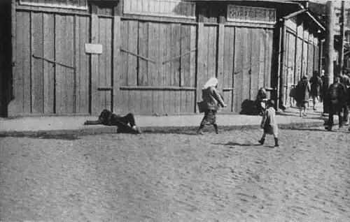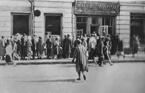 Living in Kharkiv, the then capital of the Ukrainian Soviet Socialist Republic, Wienerberger witnessed a massive famine, the Holodomor, and secretly took about 100 photographs of the scenes he saw on the streets of the city, despite the threat of arrest by the NKVD.[2] His photographs depict queues of hungry people at grocery stores, starving children, dead bodies lying on the ground, and mass graves of the victims of the Holodomor. Wienerberger created his photographs using the German Leica camera, which was probably transferred to him by friends from abroad.[1]