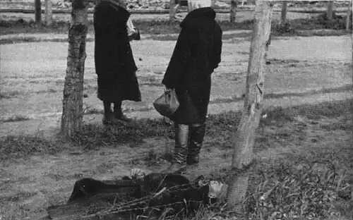 In 1934, the Patriotic Front, a far-right news paper in Austria released Wienerberger's photographs in a small brochure entitled "Rußland, wie es wirklich ist" ("Russia, as it really is"), but without attribution.[5] The photographs were first made widely available to the public in 1935, through the publication of Ammende's book, "Muss Russland Hungern?" ("Must Russia Starve?"); however, the photos were not credited because of concerns for the safety of their creator.[6]