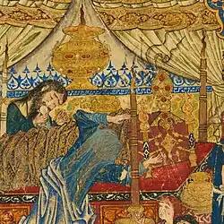 The Sīrat al-Iskandar (Life of Alexander) is a 13th-century popular Arabic-language romance about Alexander the Great. It belongs to the sīra shaʿbiyya genre.[9] In the Sīrat, Alexander is a son of Dārāb, a prince of the Achaemenid dynasty of Persia, and Nāhīd, daughter of King Philip II of Macedon. He is born in secret at Philip's court and is raised by Aristotle. He eventually succeeds Philip as king, while his half-brother Dārā succeeds to the Persian throne. They go to war and Alexander is victorious, with Dārā dying in his arms.[10] After returning to Macedon, Alexander comes under the influence of the devil, Iblīs, until he is brought back to the right path by al-Khiḍr, who convinces him he has a divine mission: to convert the whole world to monotheism. The two travel first to the West and then to the East, converting people everywhere they go. Alexander then constructs the famous wall confining Gog and Magog before setting out for the Land of Darkness to find the Water of Life. He is prevented from reaching the water by the Isrāfīl (angels), who instead give him the wonderstone. Shortly after, Alexander writes a letter of consolation to his mother and dies. He is buried in Alexandria.[10]