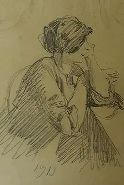 In 1894, Alexandre married Anna Karlovna Kind from a renowned Russian musical family. They first met in 1876 when Alexandre was learning music from the family patriarch, Karl Ivanovich Kind (who first came to Russia in the late 1840s, becoming a first violinist in the orchestra of the Saint Petersburg opera).[7] Alexandre played a central role in the Russian artistic community both before and after the Revolution. Anna was always by his side. Her presence was positively remembered in the artistic circles with several mentions by artist like Mstislav Dobuzhinsky. She was a model painted by Léon Bakst,[8] Valentin Serov,[9] Zinaida Serebriakova,[10] and others.