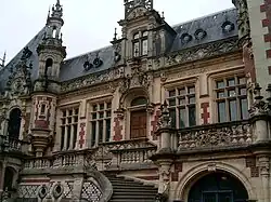 In 1876, architect Albert Camille built the Château de Gruville for Le Grand on an agricultural estate in Contremoulins. The house is asymmetrical, in block plan, using heterogeneous materials: brick, timber frame, slate, etc. Albert modified it in 1911 (adding a grand staircase) and 1923 (adding a gallery). The centerpiece of the estate, the château, was surrounded by a model farm and by water towers resembling crenellations, constructed between 1886 and 1888.