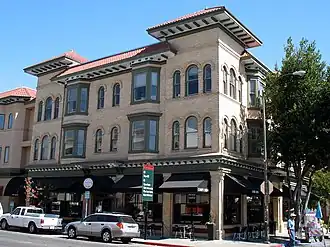 The Alexandria Hotel and Annex, also known as Plaza Hotel and Annex, is located at 840-844 Brown St. in Napa, California. Built in 1910, the hotel was a work of architect William H. Corlett. The hotel's design exemplifies the Mission Revival and Mediterranean Revival styles, which were both popular in California in the early 20th century. The design features three square towers on the street facing corners, overhanging eaves, and both slanted bay and rounded windows. The hotel's annex is older than the hotel and was redesigned to match the hotel's architecture when the hotel was built.[1][2]