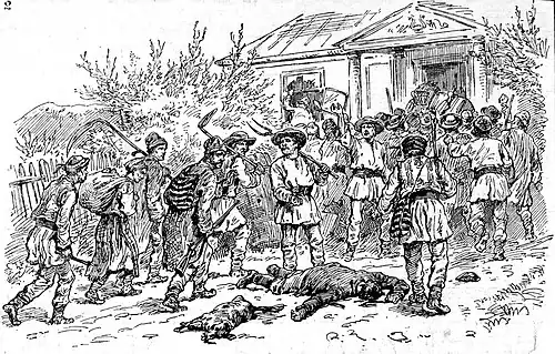 Later in 1888, a widespread anti-Carlist riot shook the Romanian countryside, and myths about Sașa's direct involvement began to spread. The rioters of Dâmbovița were persuaded that "sums of cash provided for by Cuza's boy" had been stolen by government officials.[50] One peasant rebel, who escaped into the Principality of Bulgaria, spoke about a shady connection between the Cuzas, as proponents of deeper land reform, and Russian interests in Romania. He claimed that: "Cuza's son has visited the Tsar of Russia and the latter ordered him to write to all villages so that they should kill their boyars and demand their rights [...]. Russia's emperor [...] gave money to Cuza's son, who went and bought two storage rooms full of wheat in Călărași, that the inhabitants were supposed to divide among them, but the boyars hid [that wheat]."[51] As noted by O Século, a "small group of those whom they call 'Cuzists'" was helping Alexandru to advance his vague claim to the throne; however, any proof as to whether he was actually involved in the incidents, if it existed, was made a state secret by the intervention of government officials.[45] Beldiman, who was still Cuza's political associate, saw the rebellion as entirely instigated by the Russians.[51]